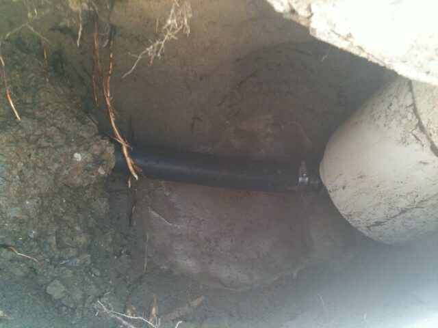 The other example is something customers or even the other companies would not think of. This pool deck was slab jacked to level out the concrete. After the deck is core drilled, liquid concrete is used to float the concrete level. The problem is that the liquid concrete used around a pool can cause major damage to the underground plumbing and equipment. It will find every open crevice and will fill with the material. This picture shows the concrete was pressurized and cracked the fitting along with the pipe going to the swimming pool skimmer.