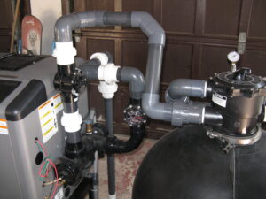 The advantages to having this operation are many, improved circulation because of less resistance going through the heater. The main advantage is life expectancy for the heater. Gas swimming pool heaters contain a heat exchanger made from copper, cupro-nickel or titanium. All are affected from water flow and when the water chemistry; salt, ph, alkalinity, calcium levels are off, this will wear down the small water ports much faster.