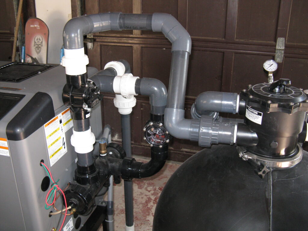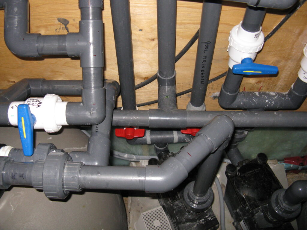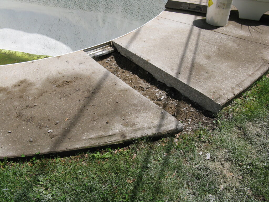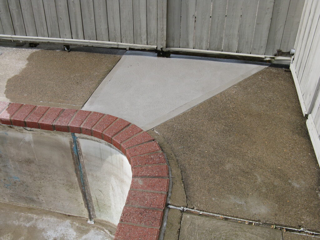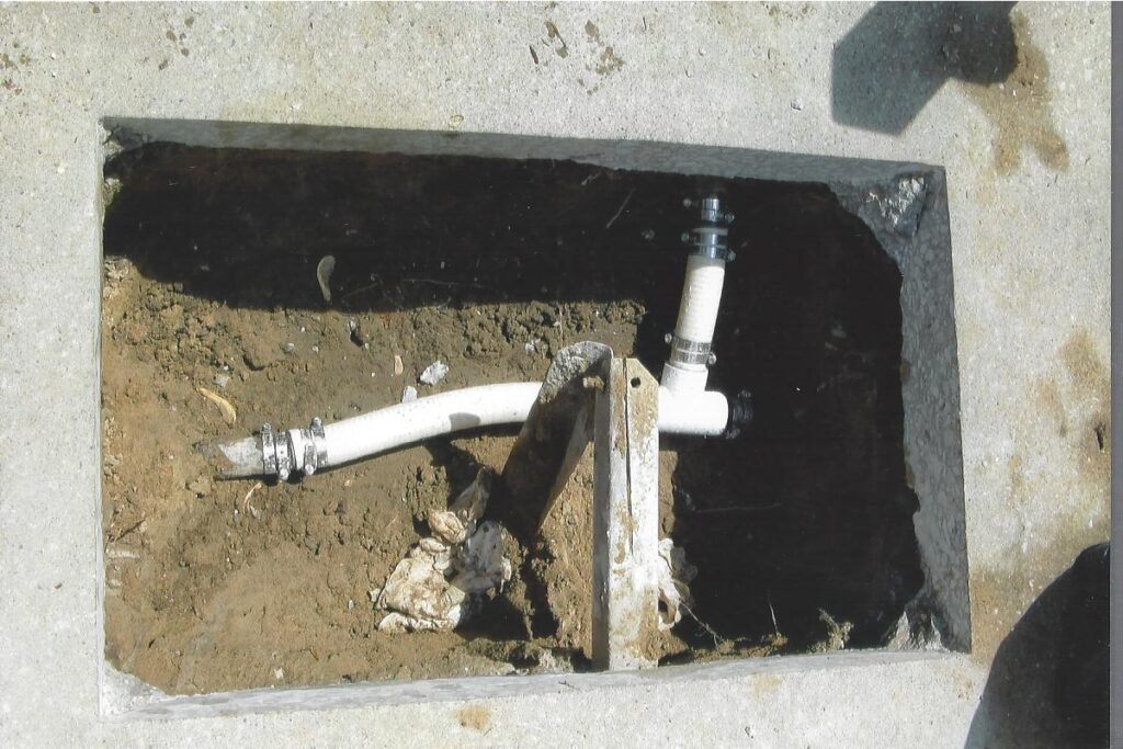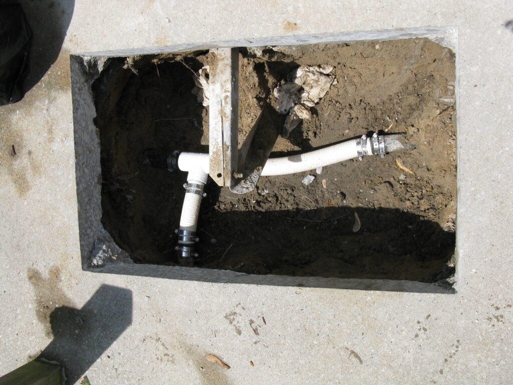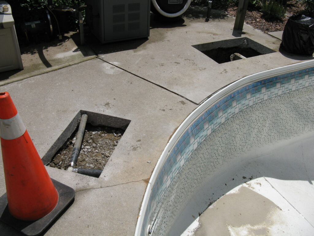 The other example is something customers or even the other companies would not think of. This pool deck was slab jacked to level out the concrete. After the deck is core drilled, liquid concrete is used to float the concrete level. The problem is that the liquid concrete used around a pool can cause major damage to the underground plumbing and equipment. It will find every open crevice and will fill with the material. This picture shows the concrete was pressurized and cracked the fitting along with the pipe going to the swimming pool skimmer.