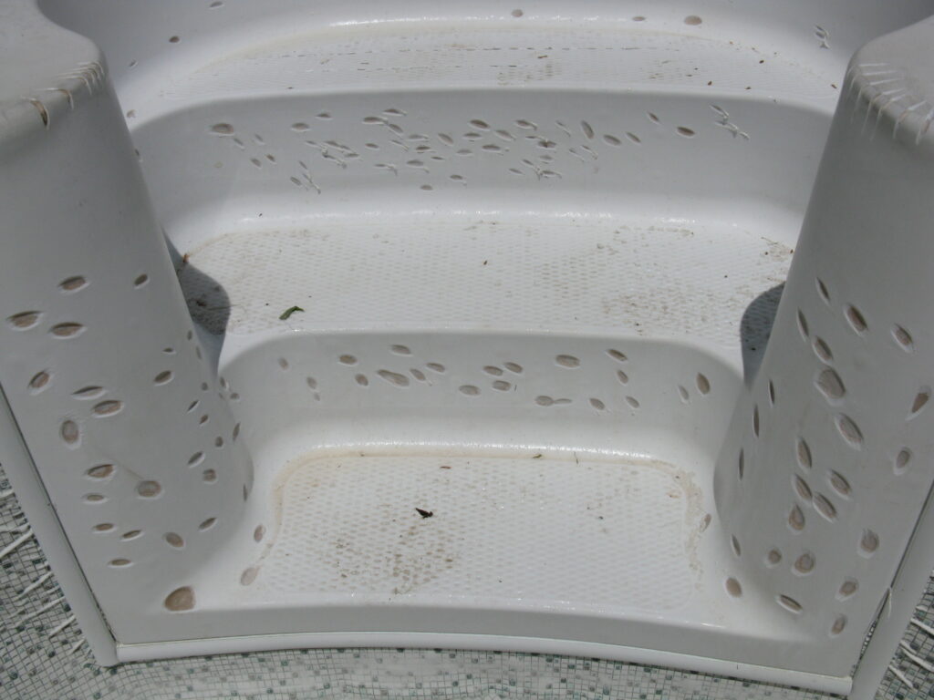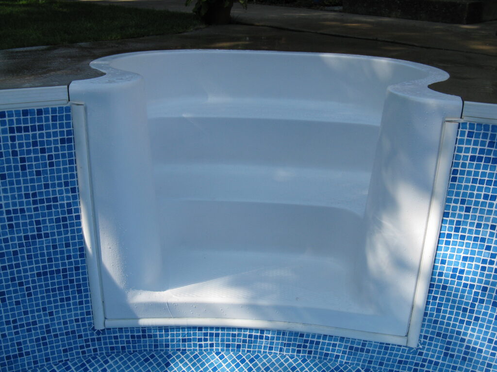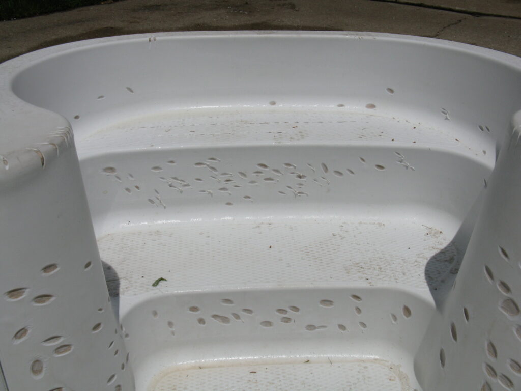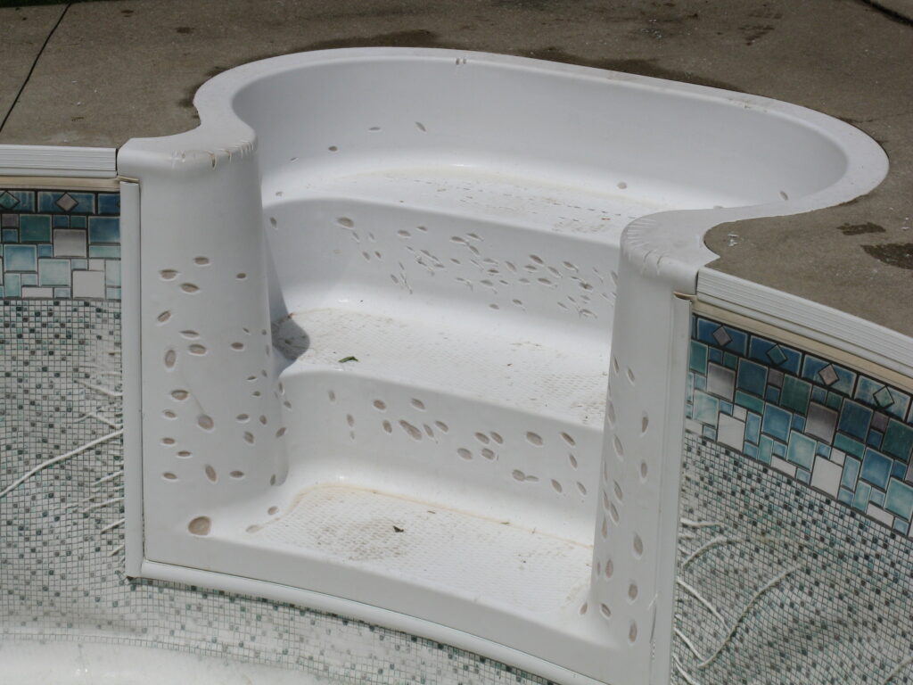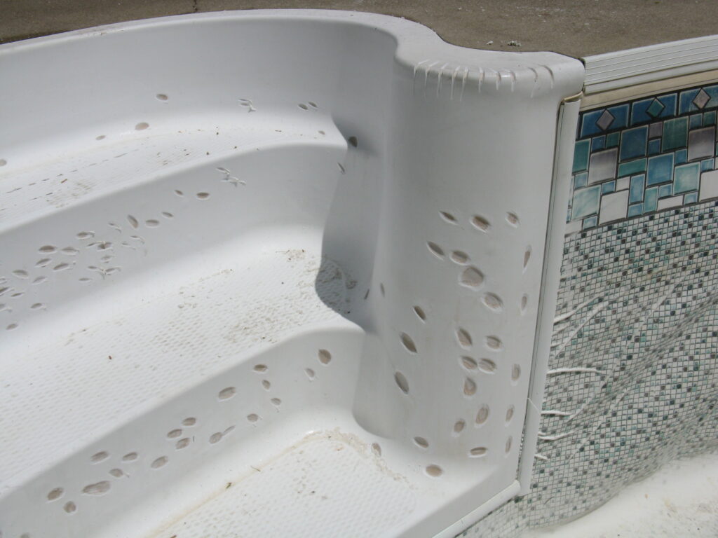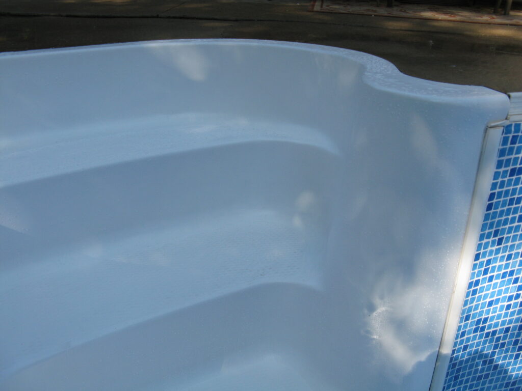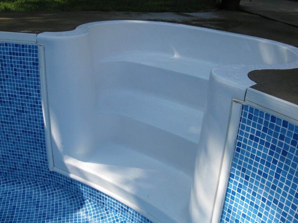 This is an example of an older fibreglass stair that had many cracks and bubbles on the top gel coat surface. All imperfections were prepped, repaired then the entire step was re-gel coated. As you can see there was quite a difference in the appearance of the before and after photos. This type of repair is easier to complete at the time of replacing the liner but could be completed at any time.