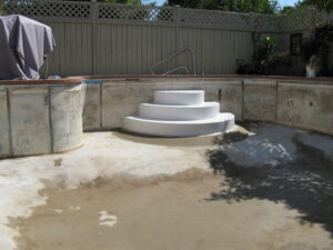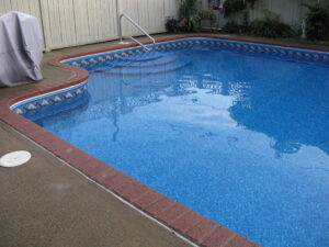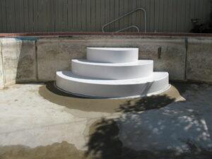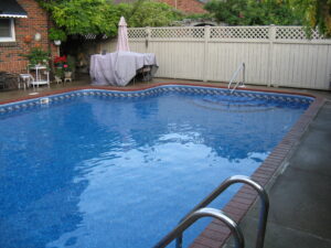 At the time on conversion Watertown installed a double aluminum coping track system to allow for a lock in winter cover. During the reconstruction this pool was also converted to a sport depth with a new grout bottom. These changes resolved the losing water issue and our customers enjoyed all the wonderful benefits of being able to use the complete are of their pool. Instead of just the small size of the shallow end they had. Flash ahead 15 years later, their pool needed a new liner to be installed. They also wanted a solution to make it easier to enter and exit their swimming pool.