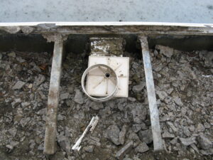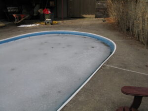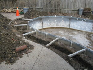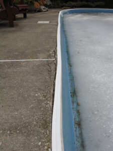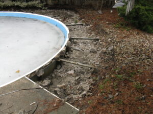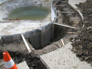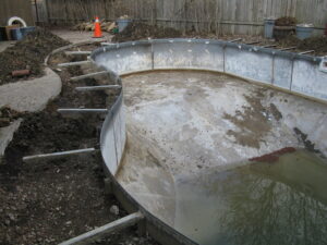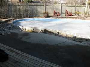 As Watertown jack hammered the concrete deck out it exposed the c-frame deck and wall supports. This type of framing members aren’t normal on all pools, but are still the very best for supporting the pool deck. When you see a pool deck tilting or falling away from the pool coping, you will know it does not have this quality of braces. Watertown removed and replaced the skimmer with a top quality wide mouth Hayward skimmer. All new Hayward returns were installed along with an extra one in the middle of the pool for better circulation, heating and chemical distribution. New filtration lines were run complete from pool to filtration system. Thick mill PVC coping was installed for the liner and lock in winter cover.