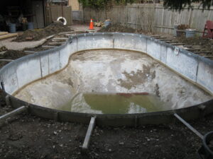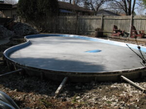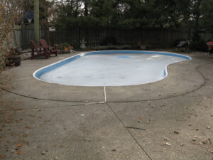 Watertown installed two aqua lights with dual transformers located with the filtration system. One is located in the deep end and the other is in the shallow end. The lights were installed on the side of the pool closest to the house to light the pool at night and not be seen from the house. A 6’French curve fibre-glass stair was installed. Concrete deck was formed, prepped and ready for a new concrete pool deck. Filtration system, along with heater was relocated inside and completely plumbed in PVC. New liner was installed, chemicals adjusted and our customers were very happy with their new swimming pool.
