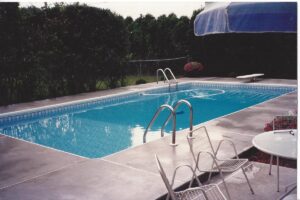 A complete new concrete deck was poured before the new liner was installed. New bronze ladder anchors and a diving board jig were installed at pour also.